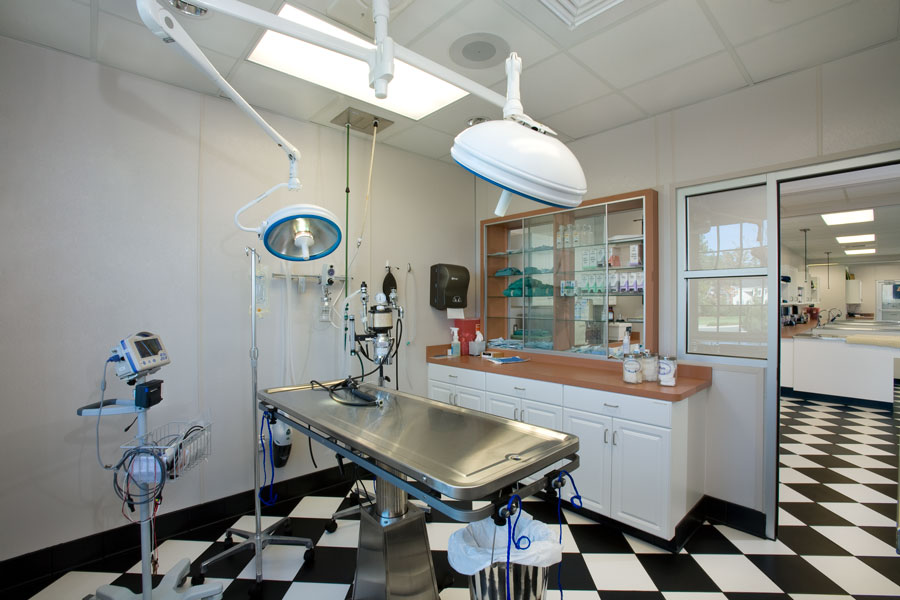 The plan consists of 6 exam rooms, 3 treatment stations, a lab, a pharmacy, one surgical suite, and a dedicated imaging area, There is a cat den and dog run for overnight stays. Administrative areas are located on the second floor.
