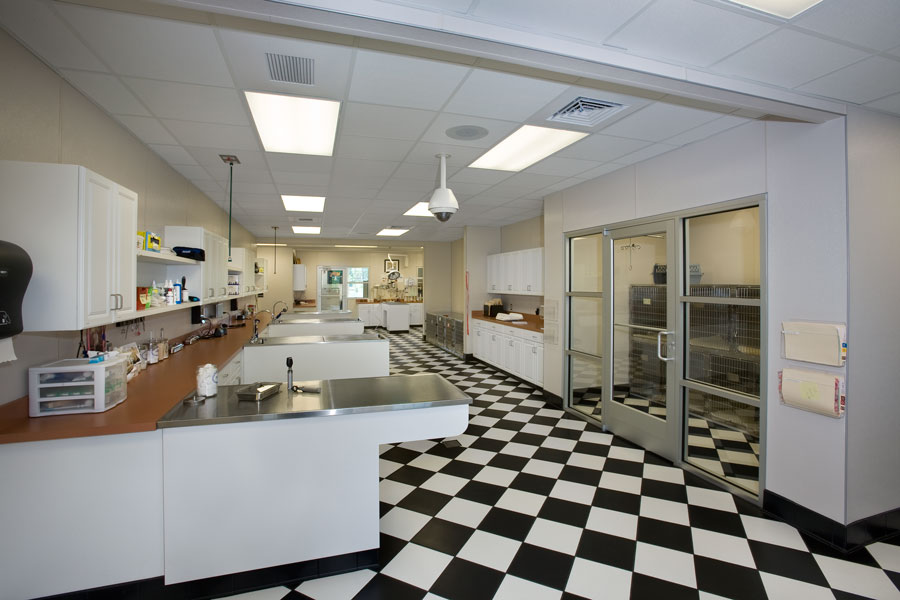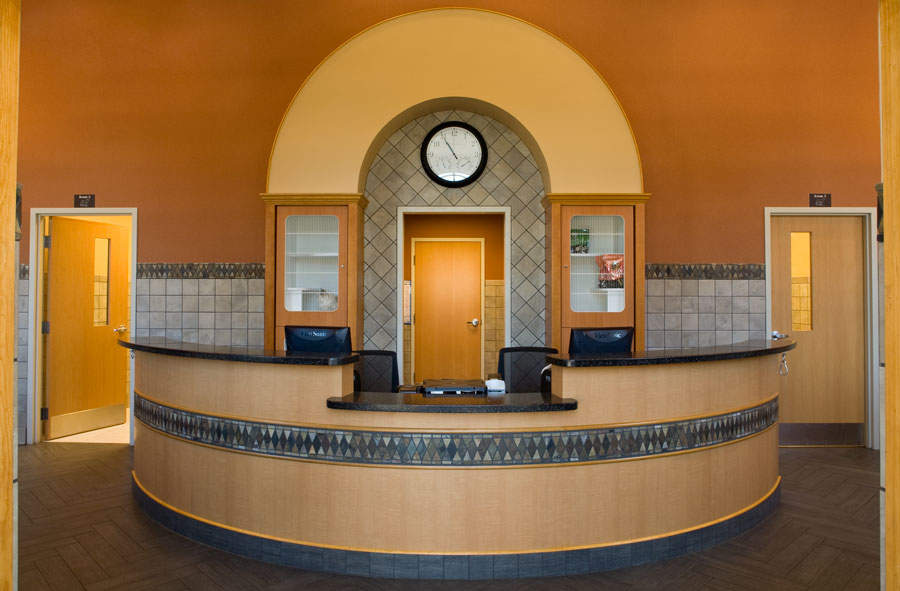 The design features a welcoming front desk and vaulted entry lobby for this no-wait concept patient care clinic. This area also has a retail area and cat adoption area.